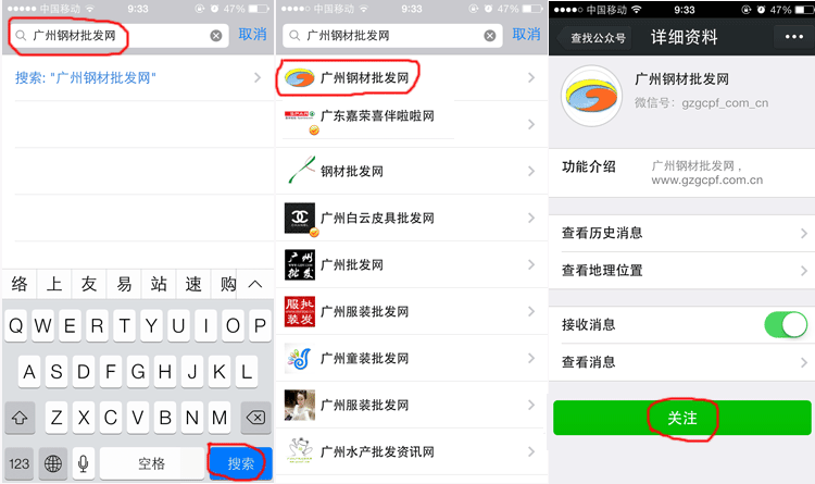 關(guān)注廣州鋼材批發(fā)網(wǎng)微信使用方法如下