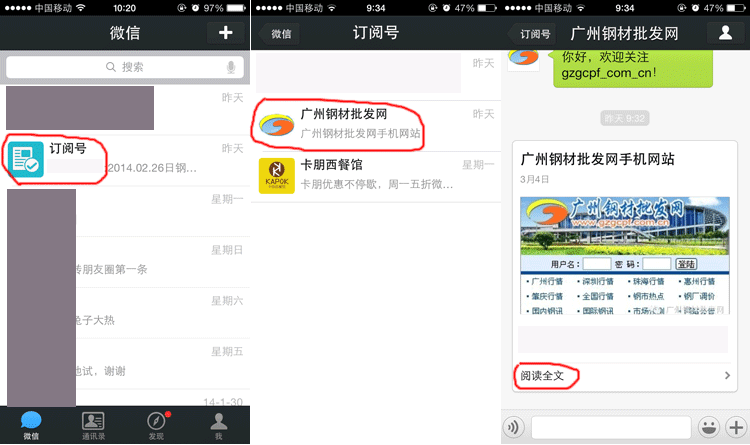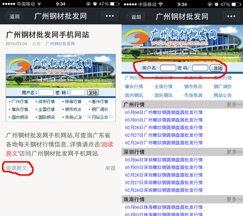 登陸微信 -> 點 通訊錄 -> 點 訂閱號 -> 點 廣東鋼材網(wǎng) -> 點 閱讀全文 ->閱讀原文 -> 輸入帳號密碼登陸即可查看